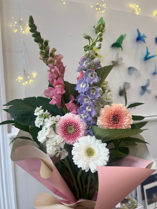 An ever-changing assortment of fresh seasonal flowers, hand-tied in store, made to order