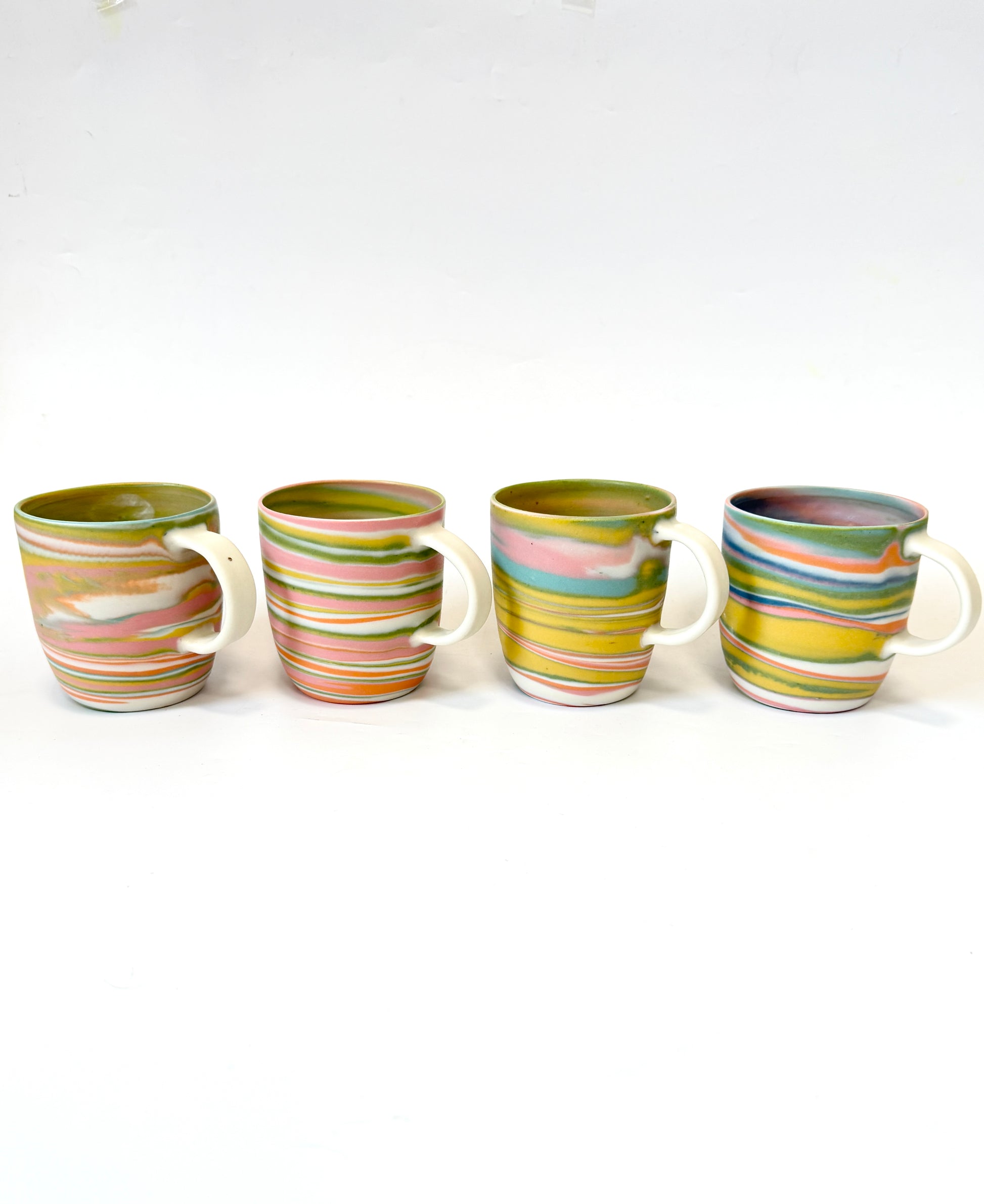 Neriage and agate-ware techniques inspired this wheel-thrown range. Different colours of clay are thrown together on the potter’s wheel, mimicking the variegated patterns of semiprecious agate stone. The swirling colour patterns are both on the exterior and interior of the piece. These fascinating colour swirls are determined by chance, resulting in a one-off wood-fired mug.