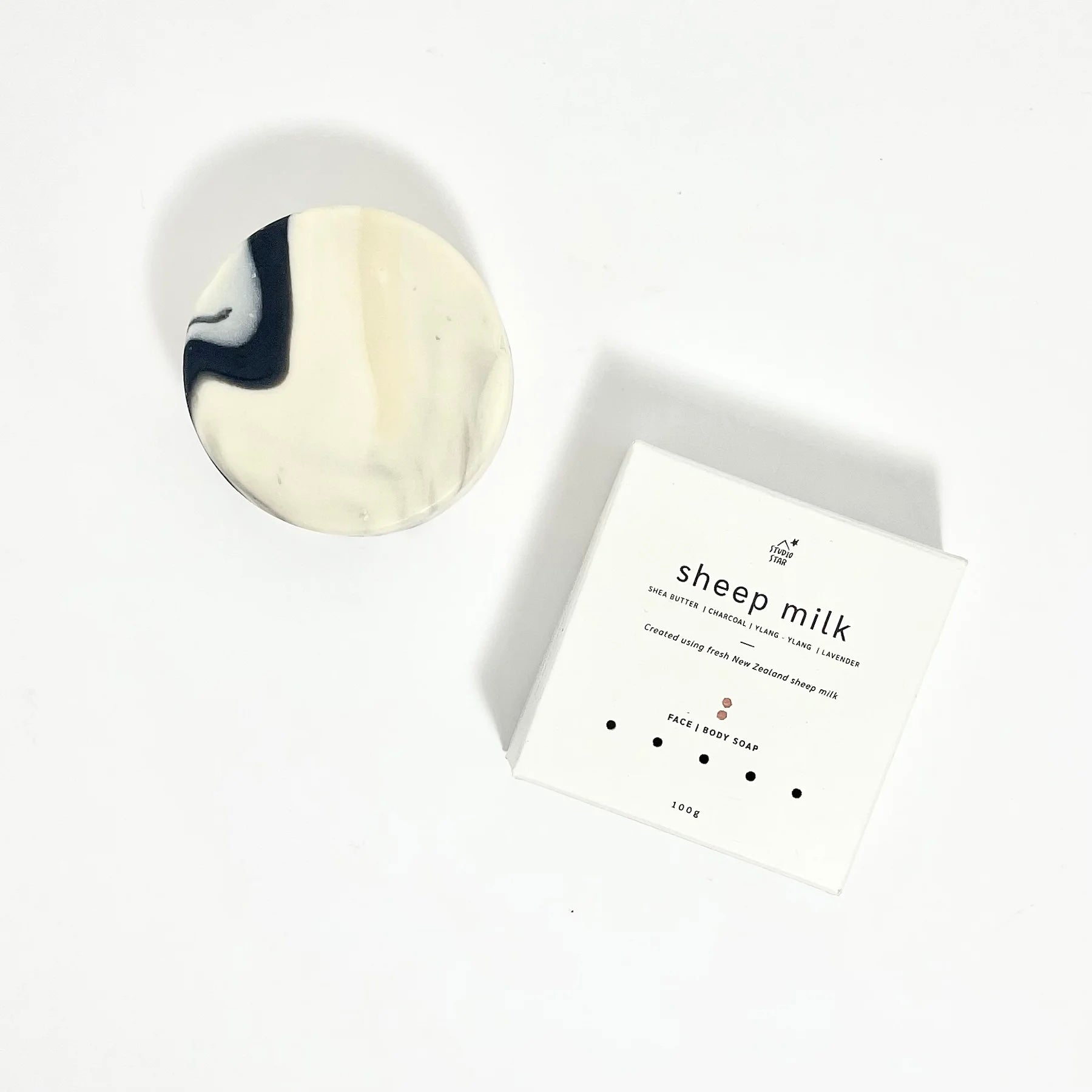 SHEEP MILK + shea butter | charcoal | ylang-ylang | lavender. A nourishing soap for sensitive or dry skin.