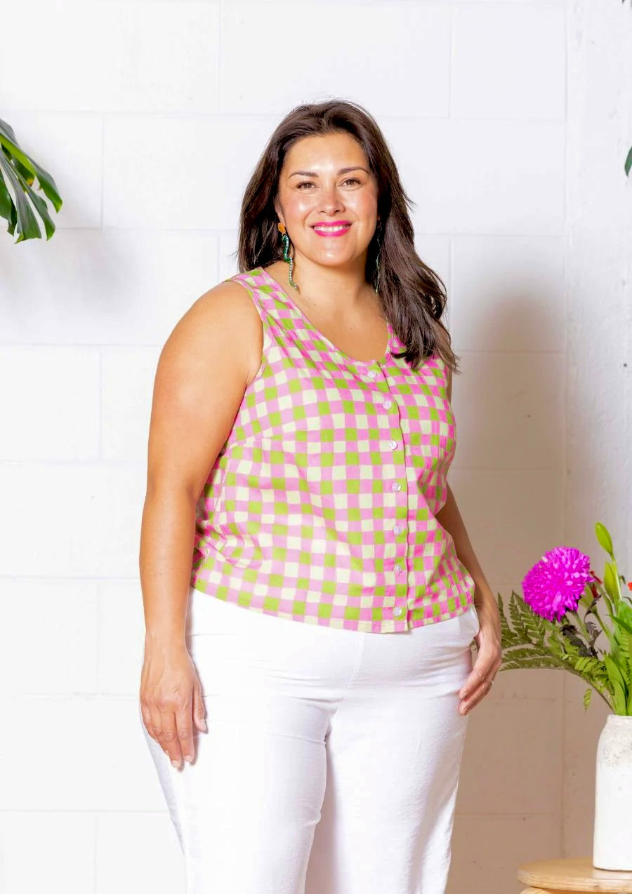 "Frankie" Singlet Top - Hand Drawn Check Citrus