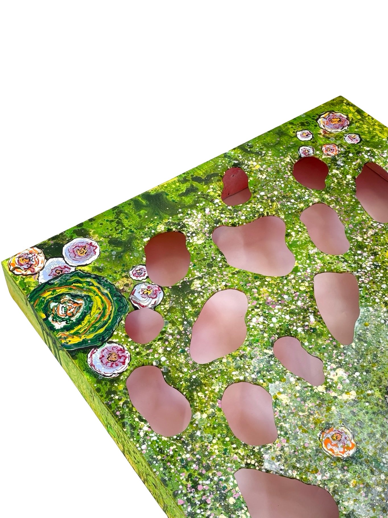 An original carved panel painting by Liz McAuliffe, a celebration of form and colour within Nature. Form, surface and shadow are an integral part of Liz McAuliffe's artworks, the cut holes create a 3-dimensional interaction between the artwork and the wall behind it. (Reminiscint of the Pohutukawa leaf artworks by Liz, also available at inc store).