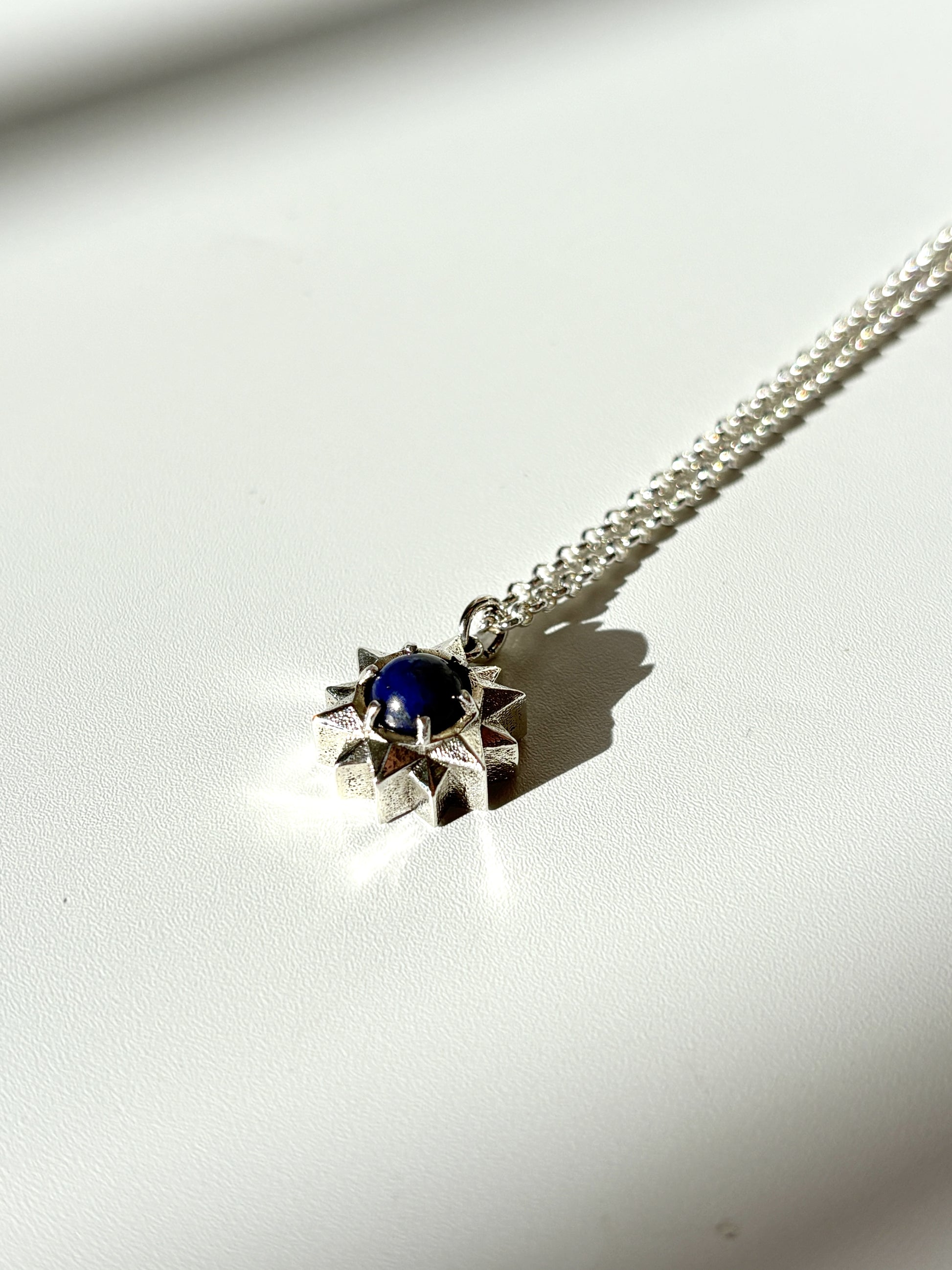 A beautiful stardrop necklace featuring a set Lapis stone and sterling silver chain.