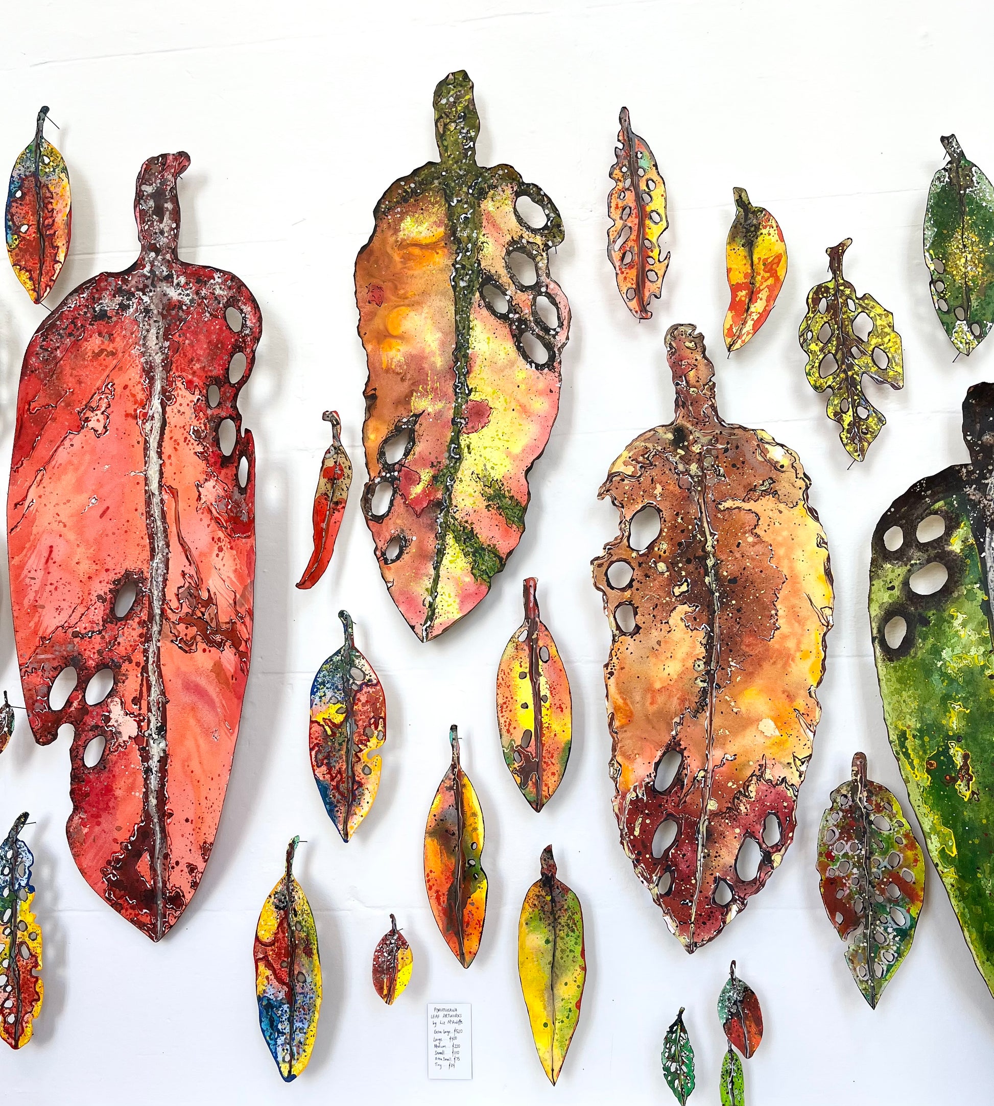 Form, surface and shadow are an integral part of Liz McAuliffe's artworks. The leaves sit closely at the intersection between 2D and 3D, being cut canvas they are flat .. then with wire and hanging points to hold them out from the wall, this gives movement and shadow, reminiscent of the dappled forest.